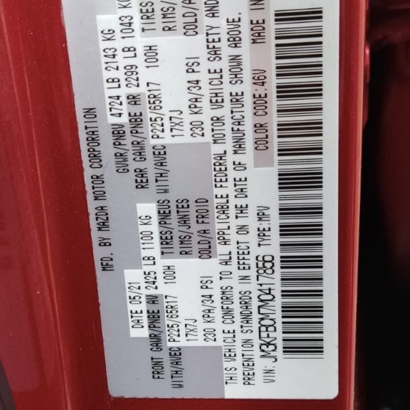 Searching for vehicle with VIN JM3KFBCM7M0417856? This page provides complete information about this 2021 Mazda CX-30 with VIN JM3KFBCM7M0417856 sold at Copart auction in Somerville, New Jersey. Looking for JM3KFBCM7M0417856 history or JM3KFBCM7M0417856 for sale information? Find all details about this stylish crossover with low mileage and normal wear below.