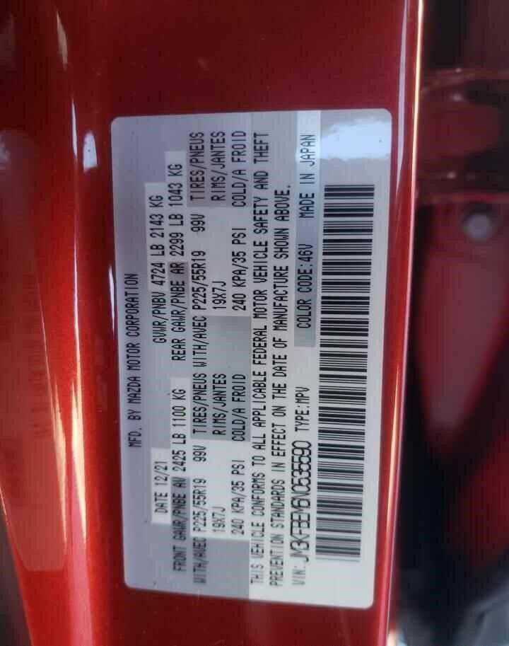 Searching for VIN JM3KFBEM6N0535590? This 2021 Mazda CX-5 with VIN JM3KFBEM6N0535590 was sold at Copart auction in Somerville, New Jersey. Looking for JM3KFBEM6N0535590 history or JM3KFBEM6N0535590 for sale information? This page provides complete details about this nearly-new red Mazda crossover with only 5,240 miles.